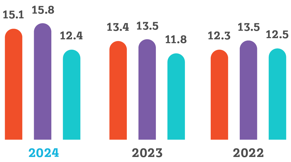 | TOTAL | 12,118 | 1,918 | 13.7 | 15,857 | 2,265 | 12.5 | 27,975 | 4,183 | 13.0 |