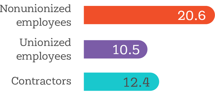 | Contractors | 4,984 | 871 | 14.9 | 9,452 | 1,167 | 11.0 | 14,436 | 2,038 | 12.4 |